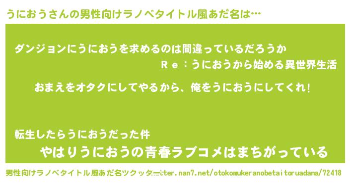 | 女子向けラノベタイトル風あだ名 | 『うにおう夫妻のなれそめ』 |