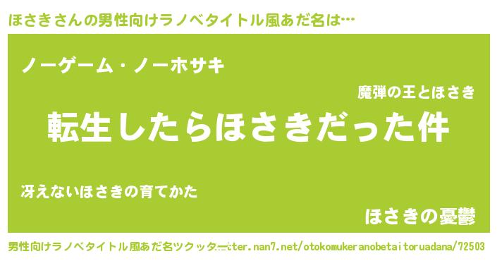 | 女子向けラノベタイトル風あだ名 | 『ほさきの玉の輿計画!』『ほさき恋絵巻』 |