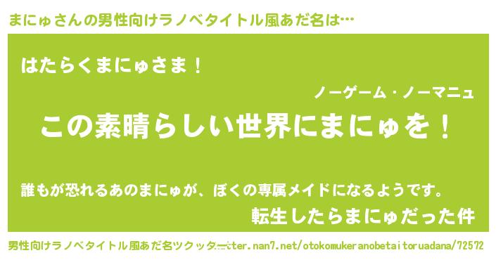 | 女子向けラノベタイトル風あだ名 | 『悪役まにゅに転生したようですが、知った事ではありません』 |