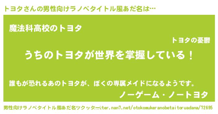 | 女子向けラノベタイトル風あだ名 | 『男装トヨタの憂鬱な任務』 |