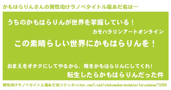 | 胡散臭い通販商品みたいなあだ名 | 『あなたにだけ特別に提供する100年もののヴィンテージワイン…その名も「かもはらりん」』 |