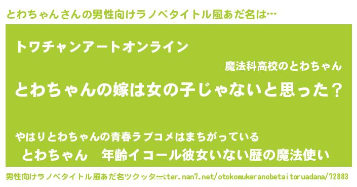 | 女子向けラノベタイトル風あだ名 | 『とわちゃん様がみてる』 |