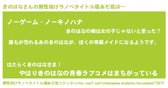 | 女子向けラノベタイトル風あだ名 | 『異世界でカフェきのはなを開店しました。』 |