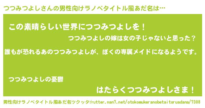 | 女子向けラノベタイトル風あだ名 | 『つつみつよしの契約王妃』 |