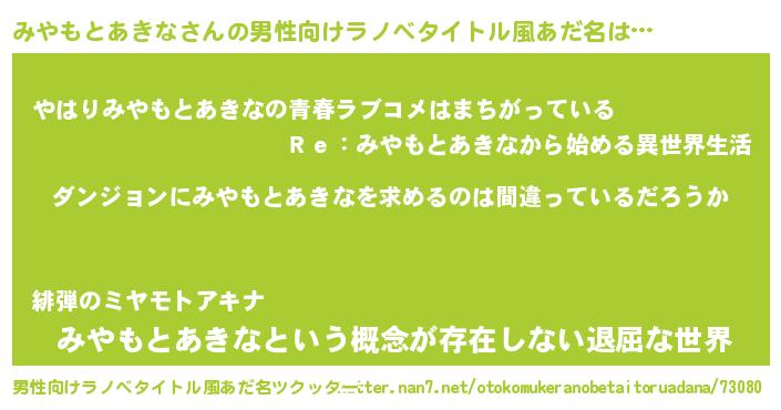 | 女子向けラノベタイトル風あだ名 | 『みやもとあきなの卵を拾いまして』 |