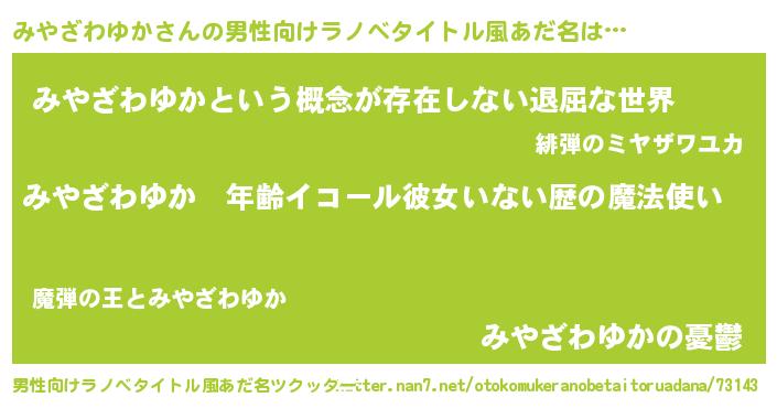 | 女子向けラノベタイトル風あだ名 | 『みやざわゆかの玉の輿計画!』 |