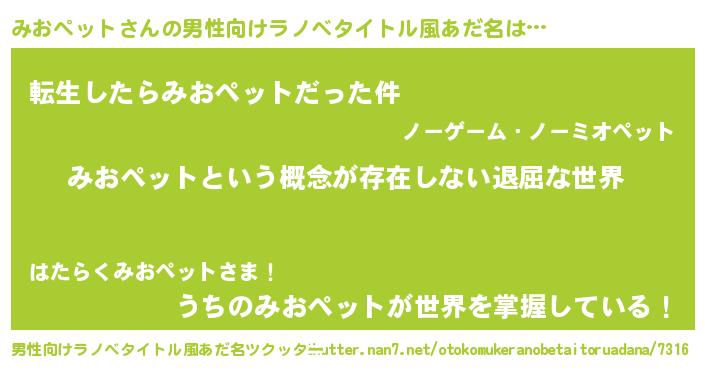 | 胡散臭い通販商品みたいなあだ名 | 『来世でも幸せになれる健康食品…その名も「みおペット」』 |