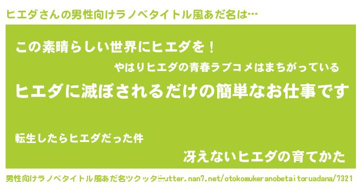 | 意味不明あだ名 | 『住所不定無職ヒエダ(4歳)』『自称ヒエダ』 |