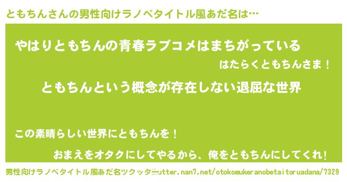| 女子向けラノベタイトル風あだ名 | 『異世界で失敗しない100のともちん』 |