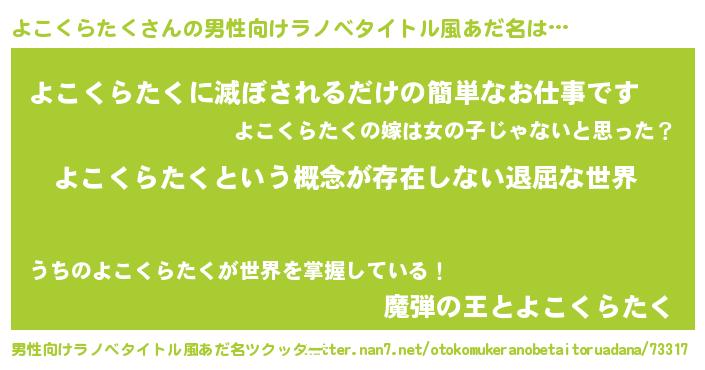 | 女子向けラノベタイトル風あだ名 | 『異世界で失敗しない100のよこくらたく』 |