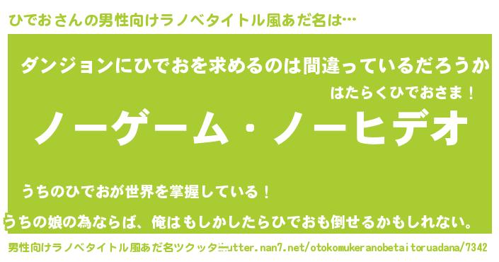 | 女子向けラノベタイトル風あだ名 | 『死神ひでおの再婚』『ひでおの婚約者』 |