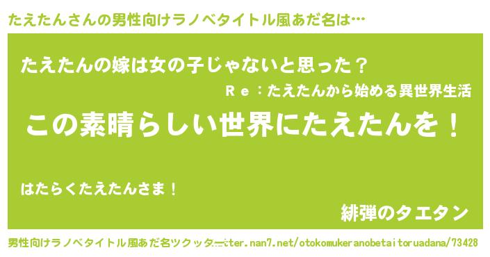 | 女子向けラノベタイトル風あだ名 | 『乙女ゲームの破滅フラグしかない悪役たえたんに転生してしまった…』 |