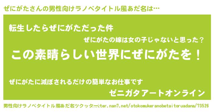 | 女子向けラノベタイトル風あだ名 | 『悪役ぜにがたに転生したようですが、知った事ではありません』 |