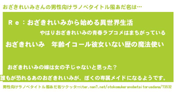 | 女子向けラノベタイトル風あだ名 | 『おざきれいみの玉の輿計画!』 |
