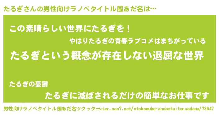 | 胡散臭い通販商品みたいなあだ名 | 『絶対に幸福をもたらす水素水…その名も「たるぎ」』 |