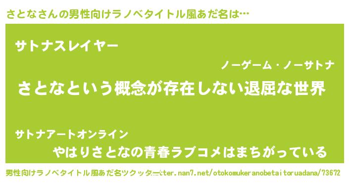| 女子向けラノベタイトル風あだ名 | 『異世界で失敗しない100のさとな』 |