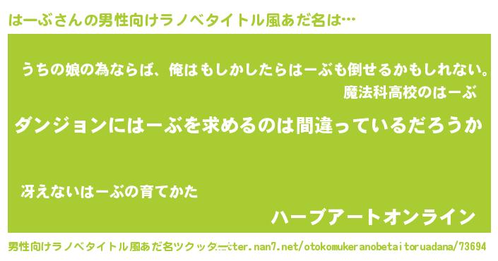 | 意味不明あだ名 | 『とにかく怪しいはーぶ』『自称はーぶ』 |