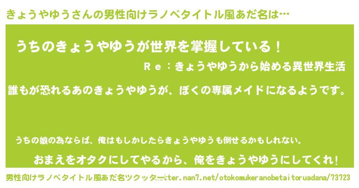 | 女子向けラノベタイトル風あだ名 | 『異世界でカフェきょうやゆうを開店しました。』 |