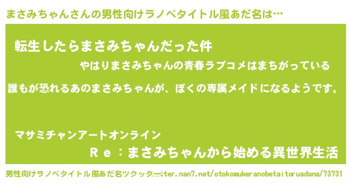 | 女子向けラノベタイトル風あだ名 | 『異世界でカフェまさみちゃんを開店しました。』 |