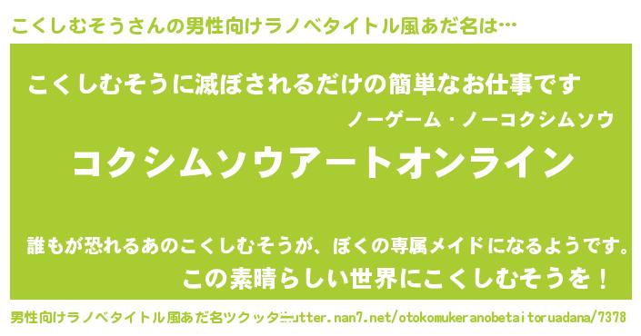 | 女子向けラノベタイトル風あだ名 | 『こくしむそう姫と円卓の騎士』 |