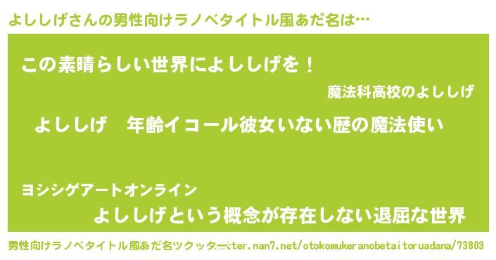 | 女子向けラノベタイトル風あだ名 | 『よししげの玉の輿計画!』 |