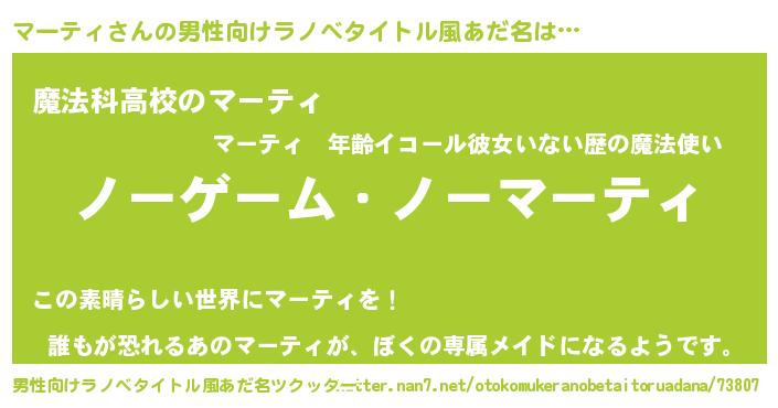 | 女子向けラノベタイトル風あだ名 | 『死神マーティの再婚』 |