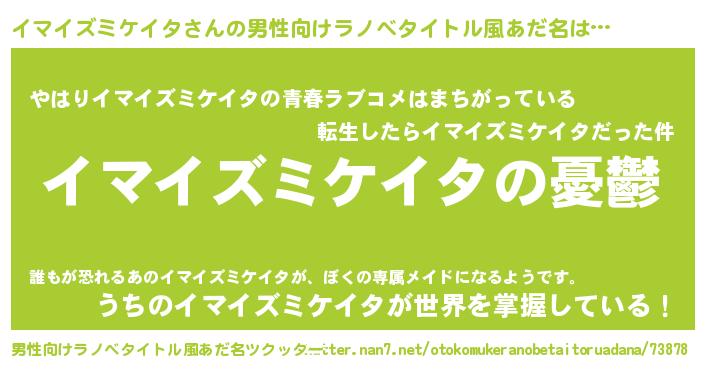 | 女子向けラノベタイトル風あだ名 | 『イマイズミケイタ姫と円卓の騎士』 |