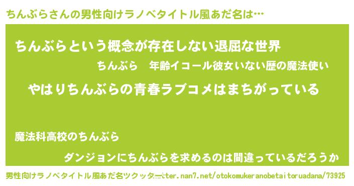 | 女子向けラノベタイトル風あだ名 | 『ちんぶらの雑貨屋さん』 |