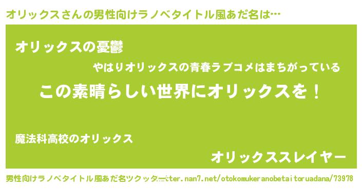 | 女子向けラノベタイトル風あだ名 | 『悪役オリックスに転生したようですが、知った事ではありません』 |