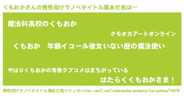 女子向けラノベタイトル風あだ名 | 『くもおかの玉の輿計画!』 |
