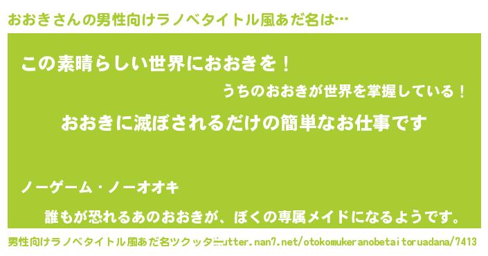 | 女子向けラノベタイトル風あだ名 | 『横柄おおきと宰相陛下』『おおき恋絵巻』 |