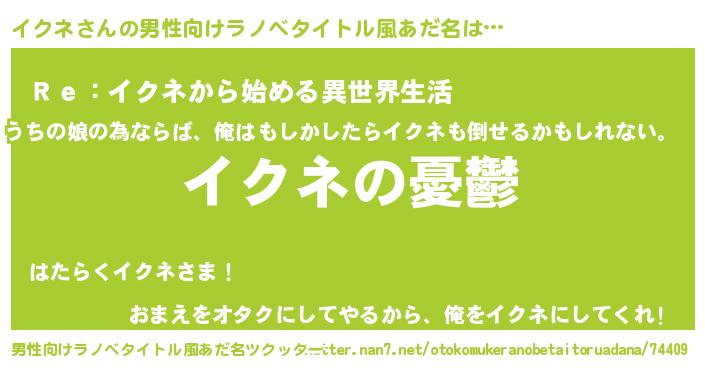 | 女子向けラノベタイトル風あだ名 | 『(仮)イクネのやんごとなき事情』 |
