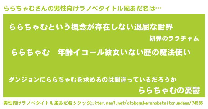 | 女子向けラノベタイトル風あだ名 | 『ららちゃむの玉の輿計画!』 |
