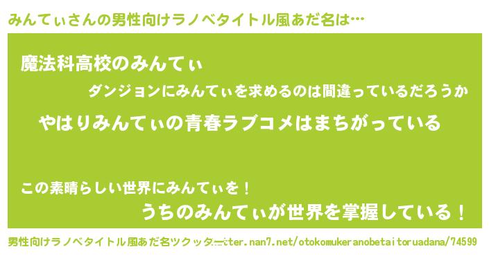 | 女子向けラノベタイトル風あだ名 | 『みんてぃの雑貨屋さん』 |