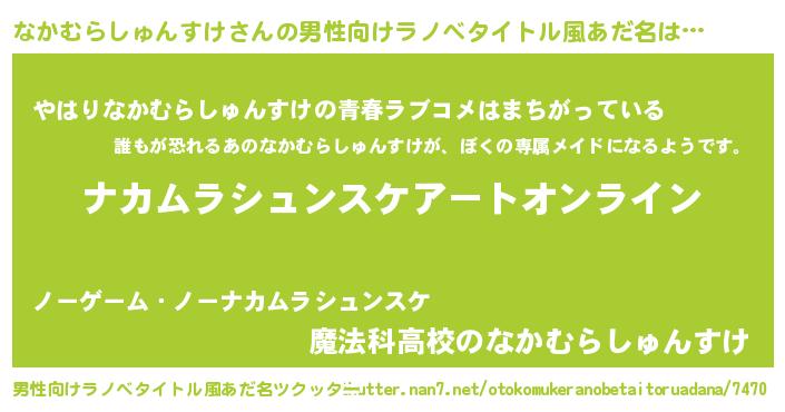 | 女子向けラノベタイトル風あだ名 | 『なかむらしゅんすけ姫と円卓の騎士』 |