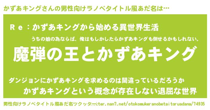 | 女子向けラノベタイトル風あだ名 | 『かずあキングが死なない童話 林檎のかずあキングの診療簿』 |