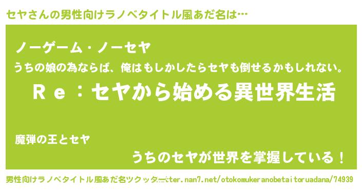 | 女子向けラノベタイトル風あだ名 | 『闇のセヤ』『死神セヤの再婚』 |