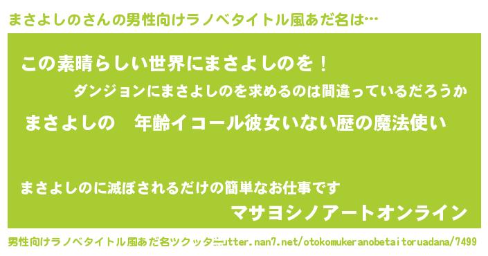 | 胡散臭い通販商品みたいなあだ名 | 『あなたにだけ特別に提供する100年もののヴィンテージワイン…その名も「まさよしの」』 |