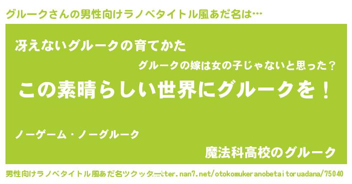 | 女子向けラノベタイトル風あだ名 | 『悪役グルークに転生したようですが、知った事ではありません』 |