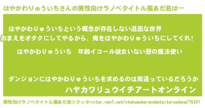 | 女子向けラノベタイトル風あだ名 | 『はやかわりゅういちの玉の輿計画!』 |