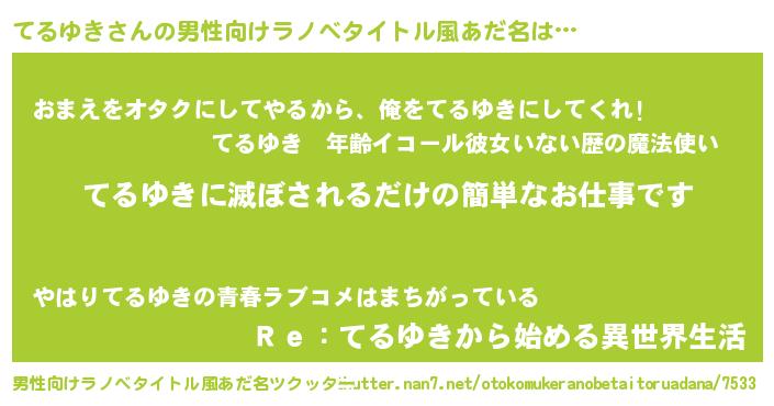 | ヒーロー風カッコイイあだ名 | 『慈愛の使者てるゆき』『天弓騎士テル』 |