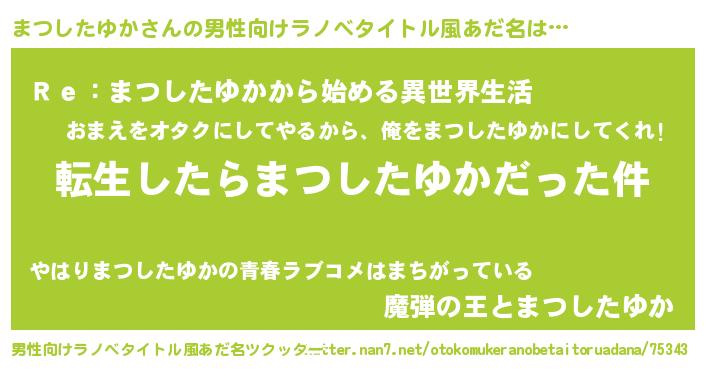 | 女子向けラノベタイトル風あだ名 | 『婚約破棄系悪役まつしたゆかに転生したので、保身に走りました。』 |