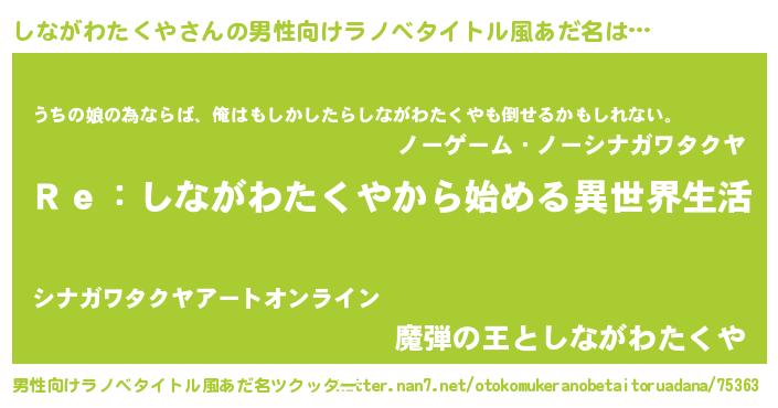 | 肩書あだ名 | 『しながわたくや閣下』 |