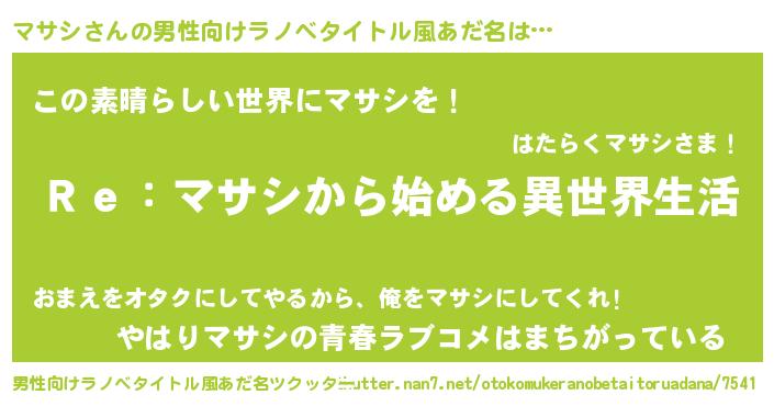 | 女子向けラノベタイトル風あだ名 | 『闇のマサシ』『マサシ伯爵の花嫁』 |