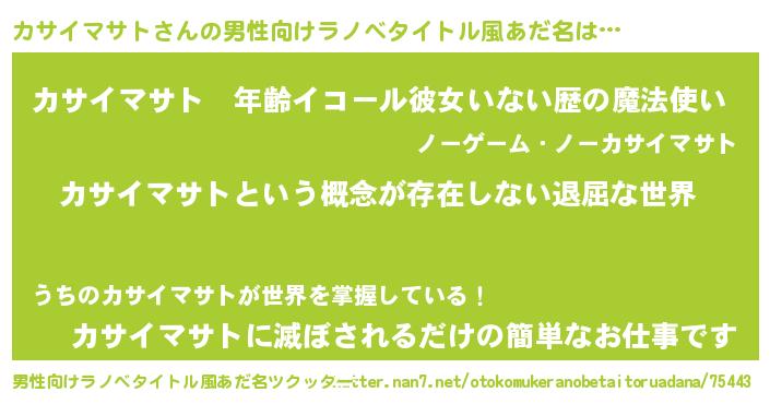 | 女子向けラノベタイトル風あだ名 | 『異世界で失敗しない100のカサイマサト』 |