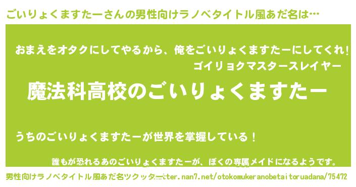 | 女子向けラノベタイトル風あだ名 | 『ごいりょくますたーなんてお断りですっ。』 |
