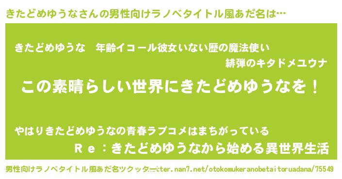 | 女子向けラノベタイトル風あだ名 | 『悪役きたどめゆうなに転生したようですが、知った事ではありません』 |