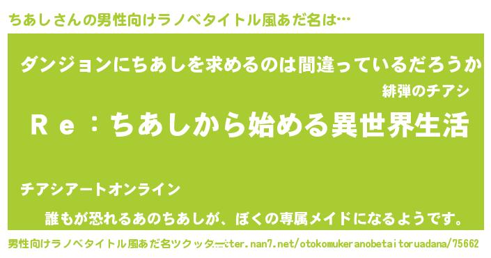 | 女子向けラノベタイトル風あだ名 | 『闇のちあし』『ちあしの卵を拾いまして』 |