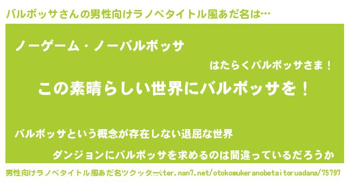 | 女子向けラノベタイトル風あだ名 | 『乙女ゲームの破滅フラグしかない悪役バルボッサに転生してしまった…』 |