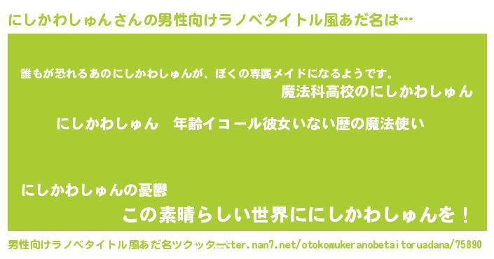 | 女子向けラノベタイトル風あだ名 | 『にしかわしゅんの玉の輿計画!』 |